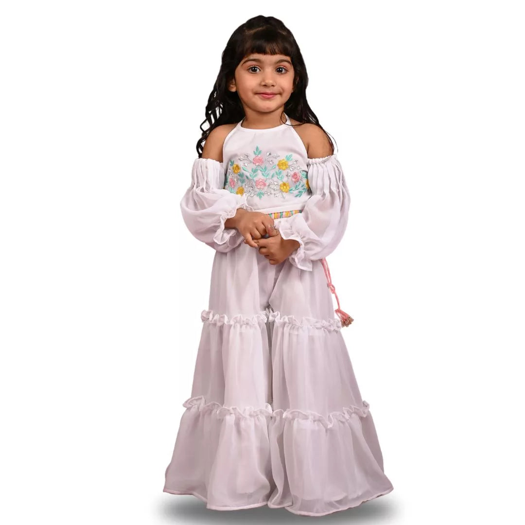 Indian girl dress with multicolour threadwork flowers and leaves on yoke, cold shoulder flairy sleeves, lace on front of blouse.Ivory blouse with layered sharara