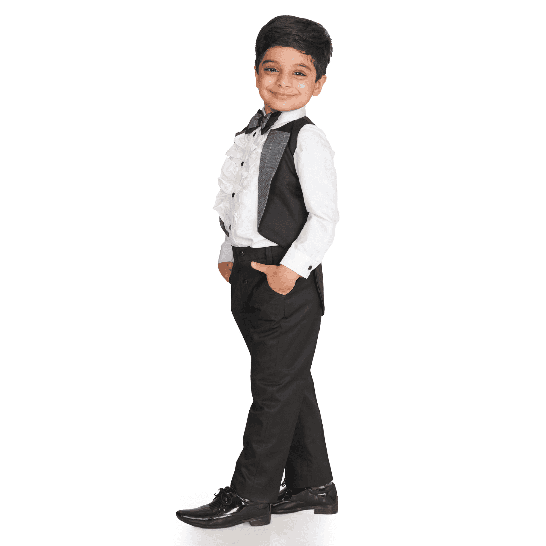 Black tail coat with check lapel, pants and bow with white frill shirt.