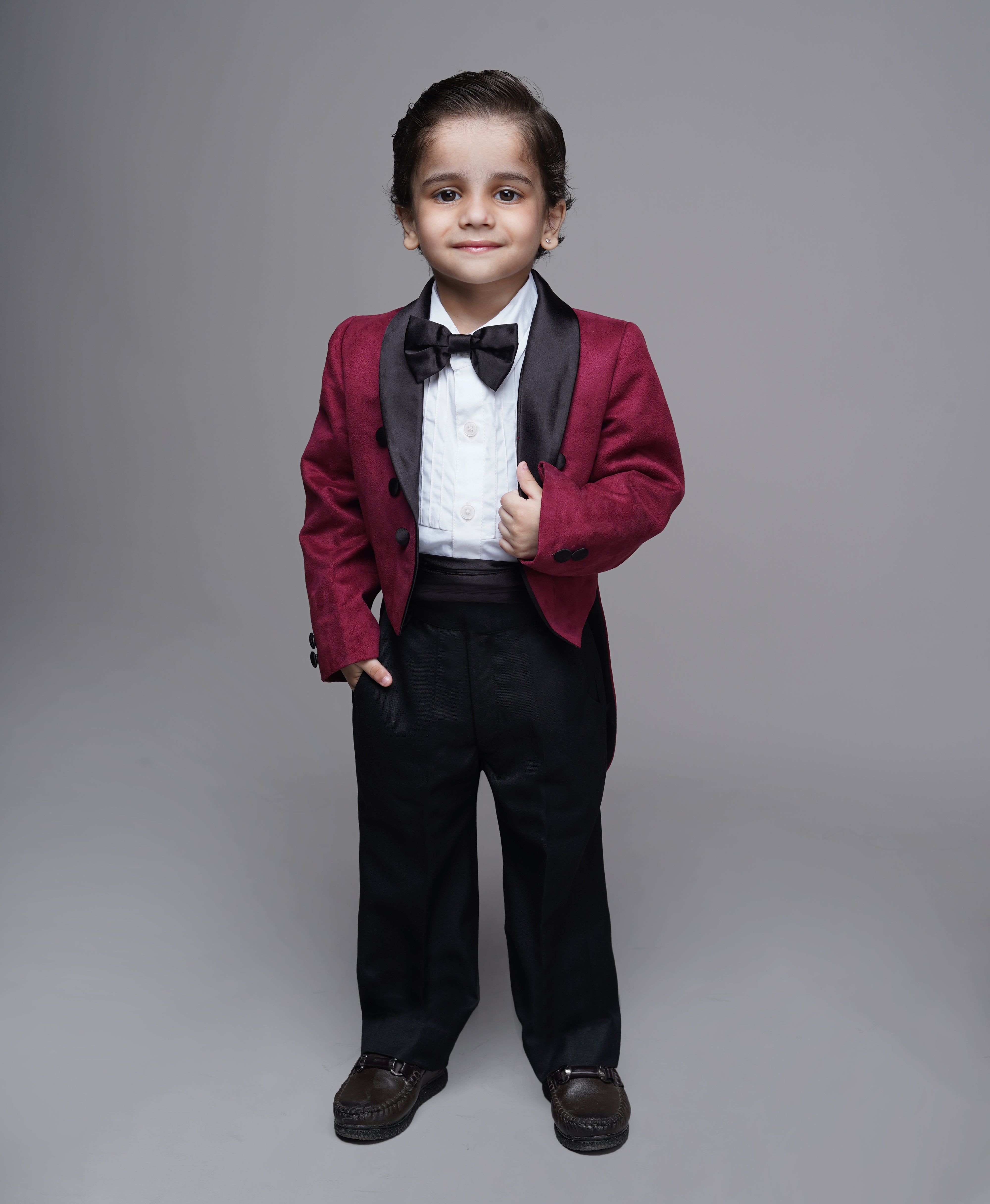 Marroon tail coat with black lapel,white shirt, black pants, tuxedo belt, and black bow.