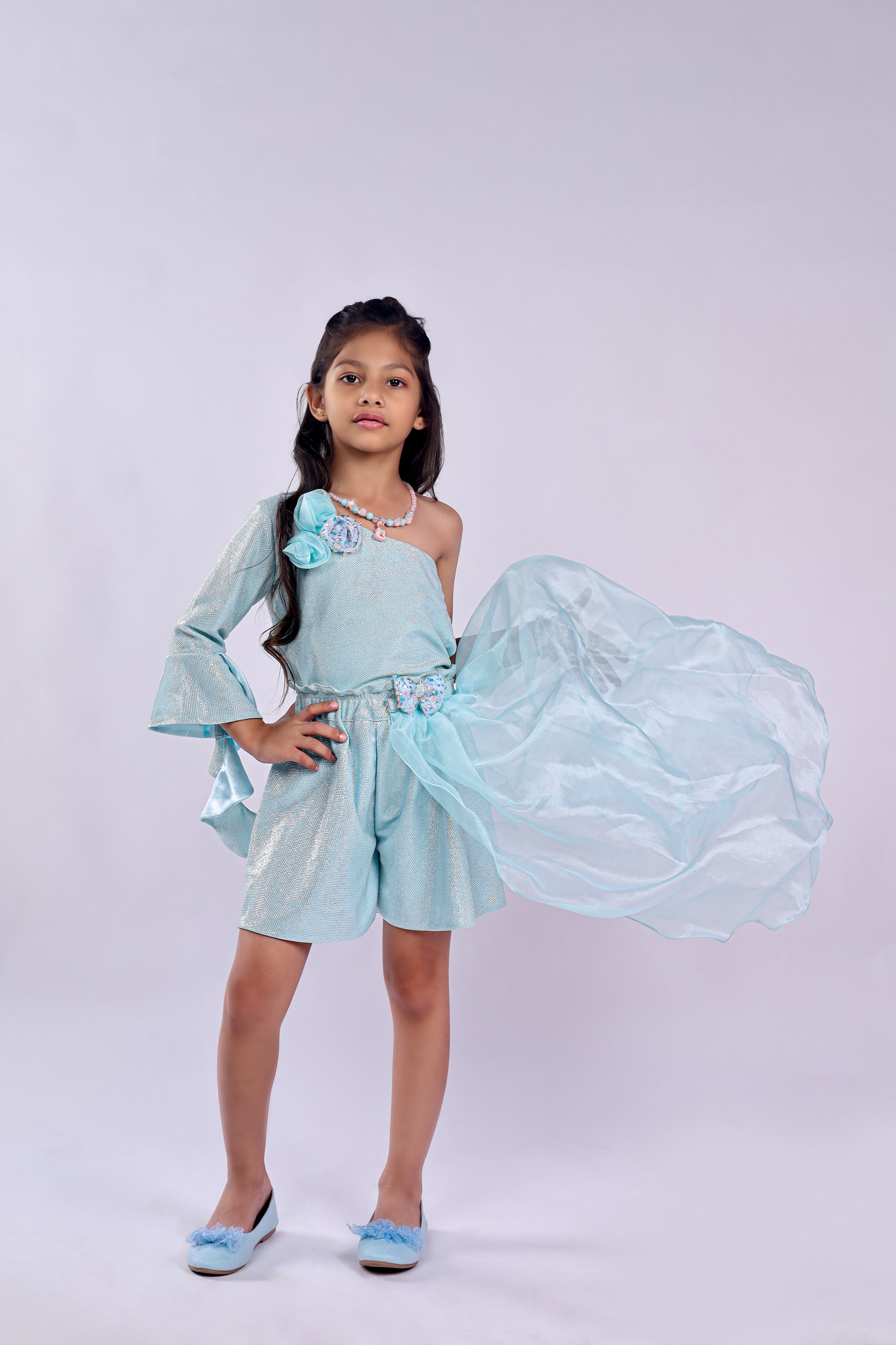 Sky blue metallic lurex one-shoulder top and shorts set with a detachable side trail.